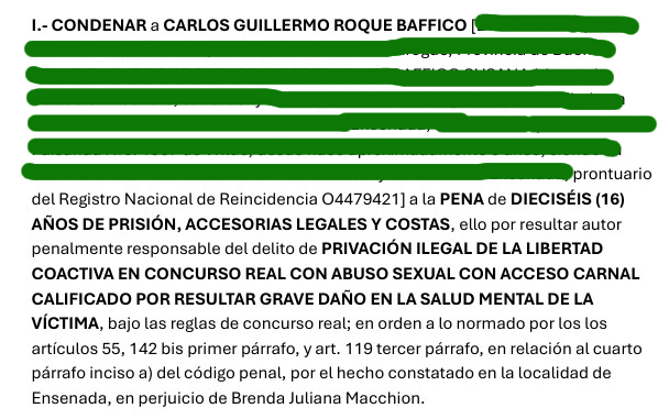 La justicia condenó a Carlos Guillermo Roque Baffico a 16 ( dieciséis ) años de prisión por secuestrar, golpear y abusar sexualmente de su ex pareja, Brenda. El infeliz no sólo la tuvo cautiva, atada de pies y manos, con una media en la boca y junto a su bebé recién nacido; sino que también la siguió amenazando y acosando por redes sociales mientras cumplía prisión preventiva en la Unidad Penal N°1 de Olmos.