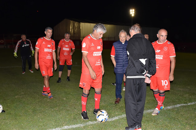 Una de las notas emocionantes de la noche fue la presencia en el terreno de juego del máximo goleador de la historia de la institución. Con sus jóvenes 91 años, Julio Rodríguez, ataviado de una camiseta retro que en su momento le regaló la institución, se dio el gusto de dar el puntapié inicial previo al partido que protagonizaron las glorias del Rojo con los seniors del Pincha y el Lobo.
