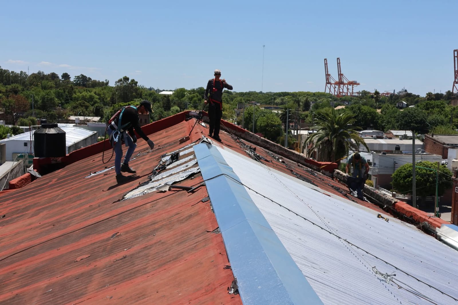 Se está realizando el trabajo del nuevo techo con canaletas y bajadas en el histórico edificio de la Sociedad Italiana.
