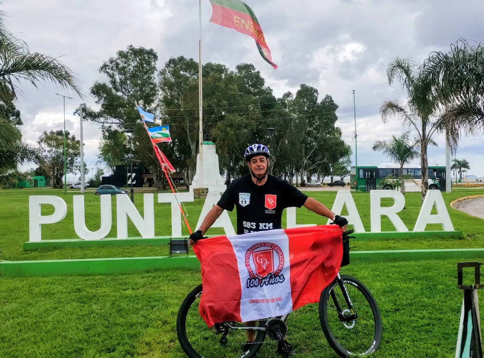 El socio Roberto Irigoiti comenzó la gran pedaleada "583 Kilómetros de Pasión" en homenaje al Aniversario 104 de nuestro querido Defensores. Partió desde el inicio de la ruta 11, en el puente antiguo de Boca Cerrada.